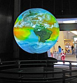 利用特殊的光学镜头和修正软件,将普通的平面影像进行特殊的处理变换,投射到一个球形的屏幕内,形成一个内投的球体影像。通过先进的计算机视觉技术和投影显示技术,使整个球体成为一个炫目的360度触摸屏交互屏幕,显示出震撼的动态效果,形状可以是半球或者整球。可作为地理教学或企业全球网点分布查询介绍。
